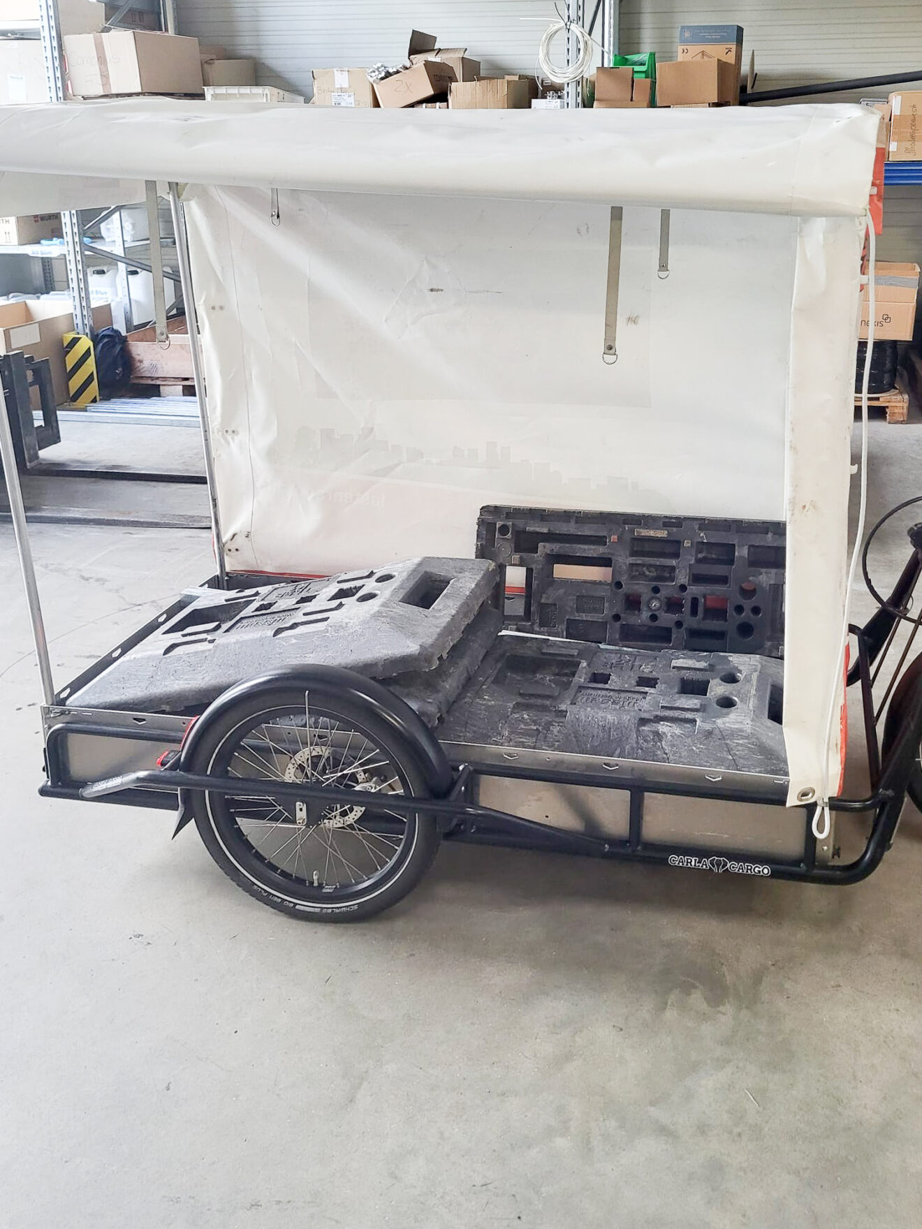 - Fracht: Verkehrsschilder mit Standfüßen. Jedes Schild besteht aus 3 Gummifüßen zu je 27 kg plus Vierkantrohr, Verkehrsschild und Metallklammern. Der Hersteller des Fahrrad-Anhängers gibt für die Variante mit Planen-Aufbau eine maximale Nutzlast von 181 Kilogramm an.