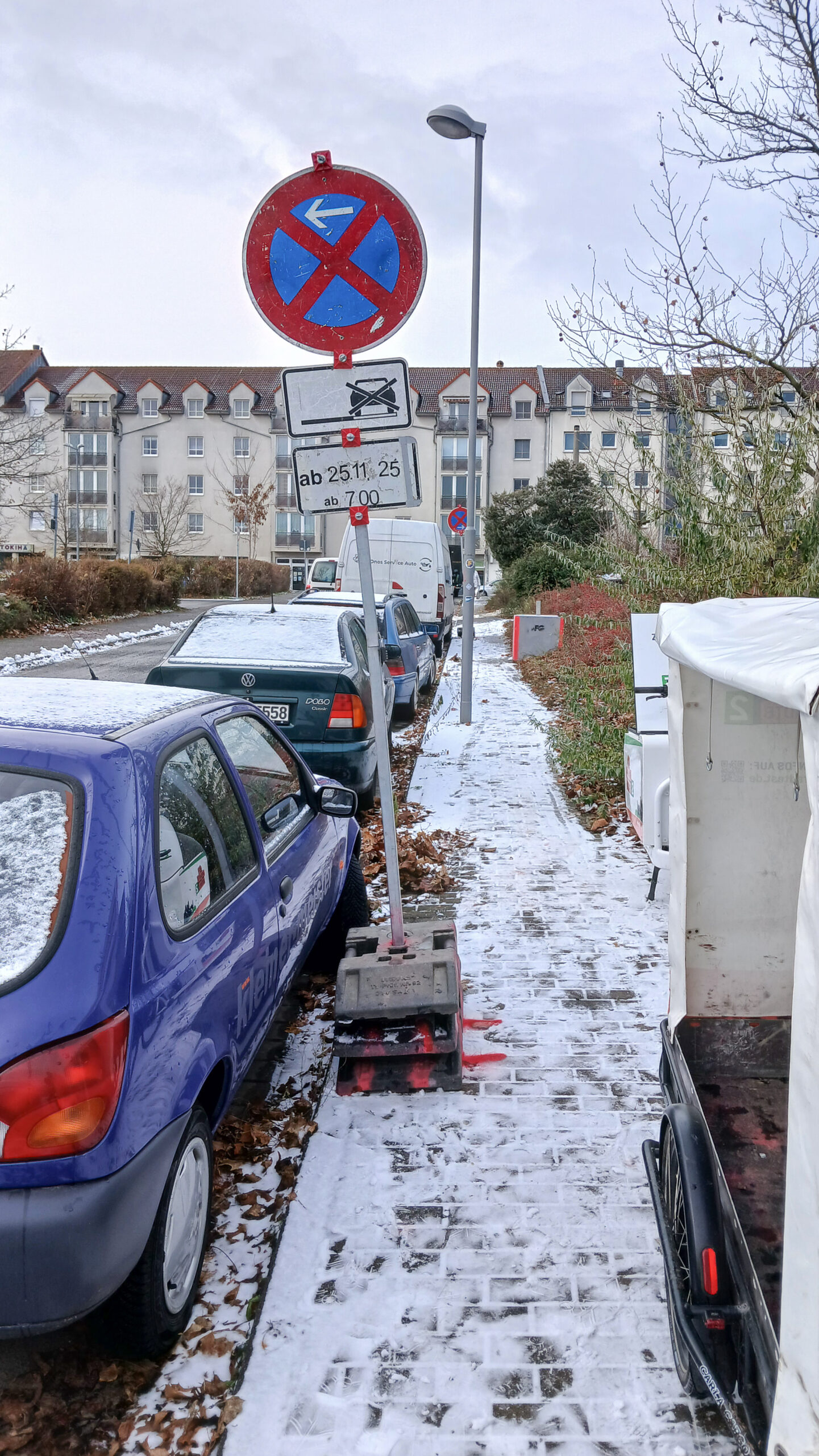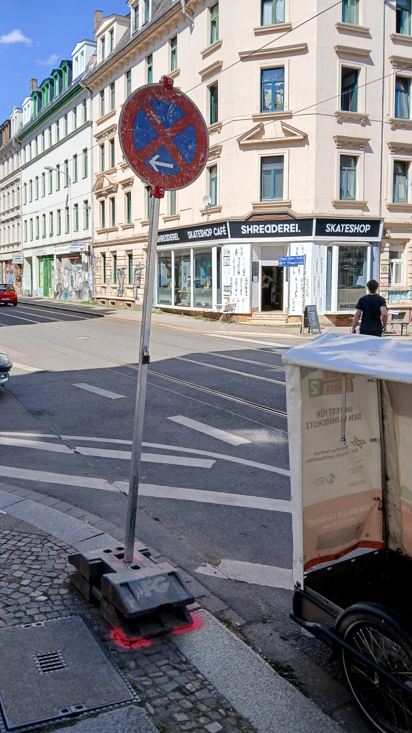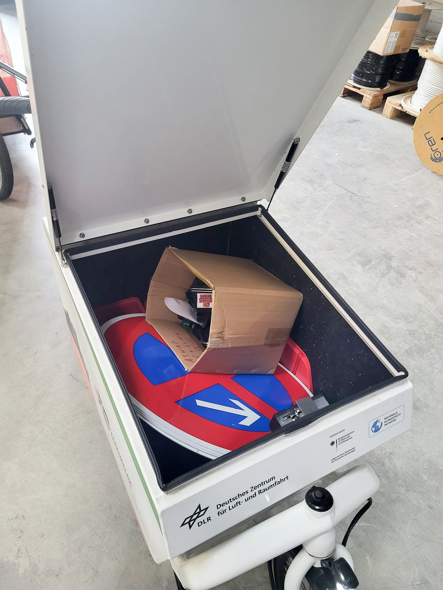 - Fracht: Verkehrsschilder mit Standfüßen. Jedes Schild besteht aus 3 Gummifüßen zu je 27 kg plus Vierkantrohr, Verkehrsschild und Metallklammern. Der Hersteller des Fahrrad-Anhängers gibt für die Variante mit Planen-Aufbau eine maximale Nutzlast von 181 Kilogramm an.