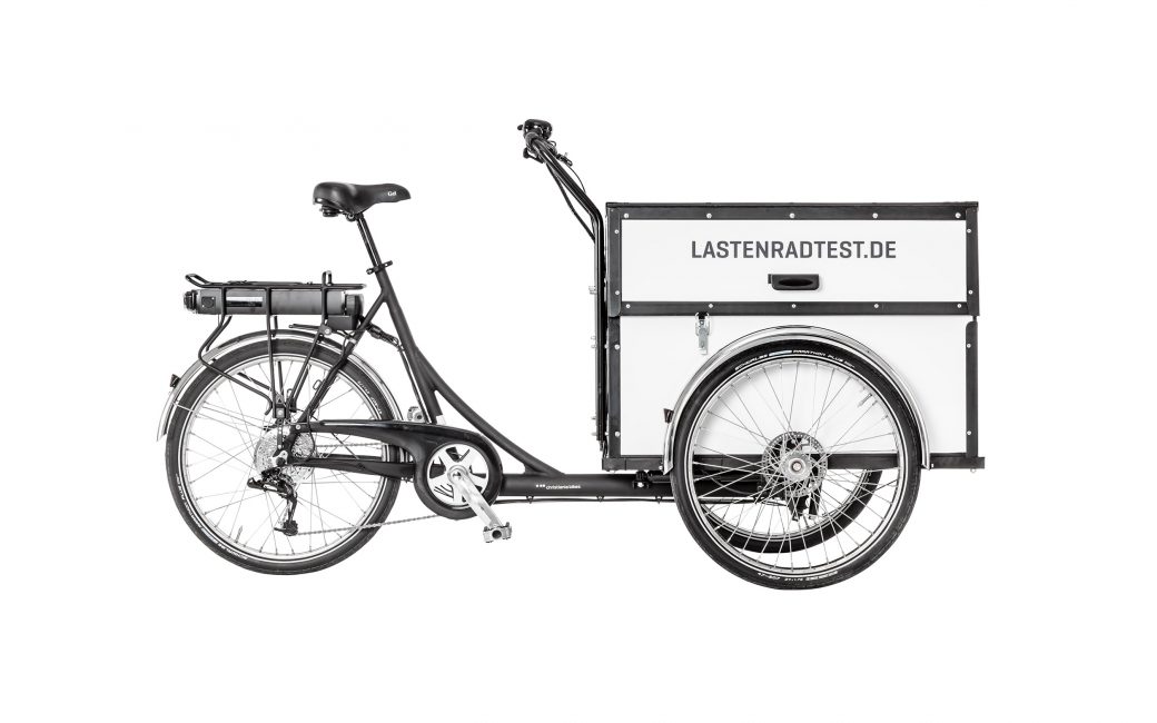 Long John mit kleinem Wendekreis dank Seilzuglenkung. Schlanke 200 Liter Transportbox. Selbes Grundmodell wie Urban-e KEP10. Hinterradmotor.