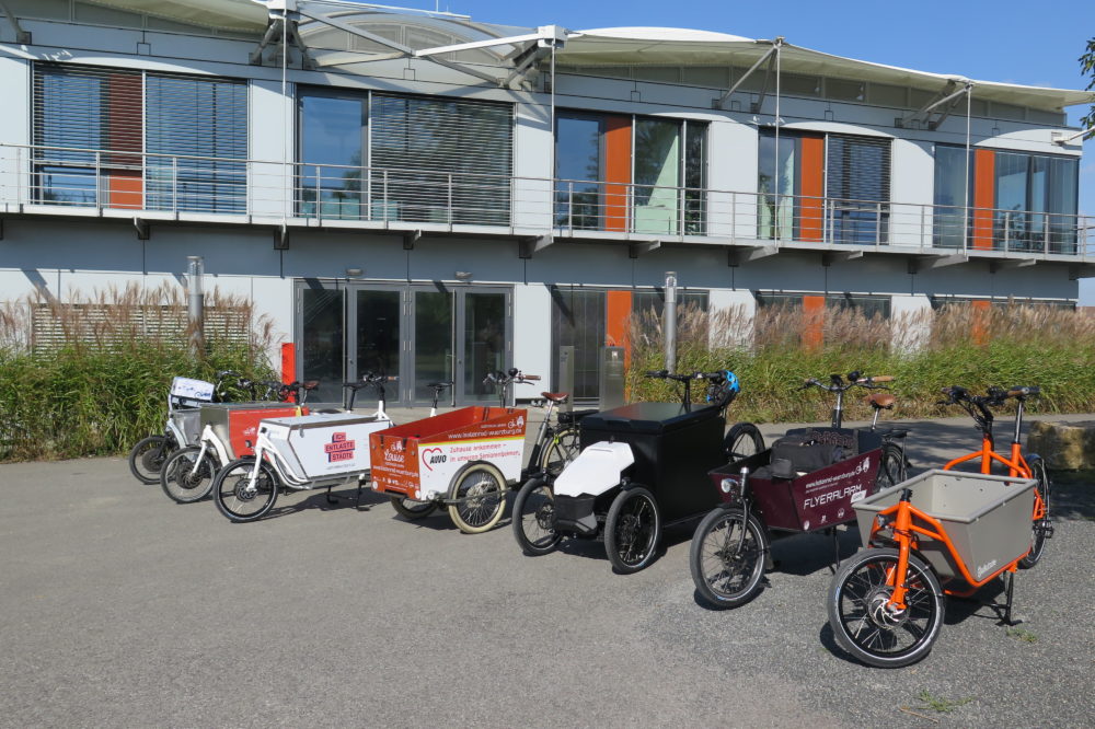 Im Anschluss an die Veranstaltung fand vor dem ZAE Gebäude noch ein munteres Lastenrad-Probefahren statt. Lokale Händler und Nutzer sowie ein angereister Hersteller hatten dafür rund zehn Lastenräder bereit gestellt.