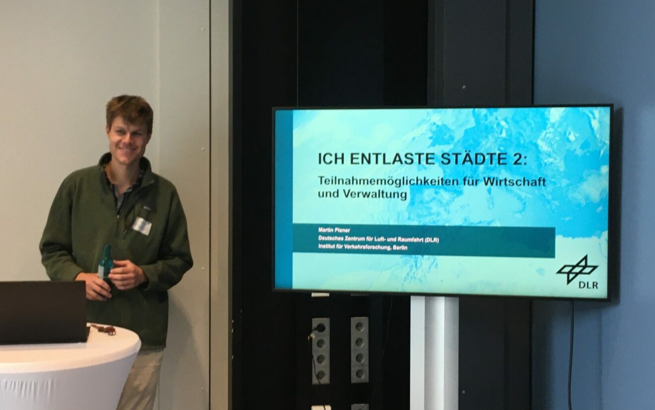 Mit dabei: Das Team von Ich entlaste Städte 2, mit einem Infostand auf der Außenfläche der Stadthalle Troisdorf sowie mit einem Vortrag über das Projekt. Martin Plener vom Projektteam, DLR Institut für Verkehrsforschung, informierte über Teilnahmemöglichkeiten.