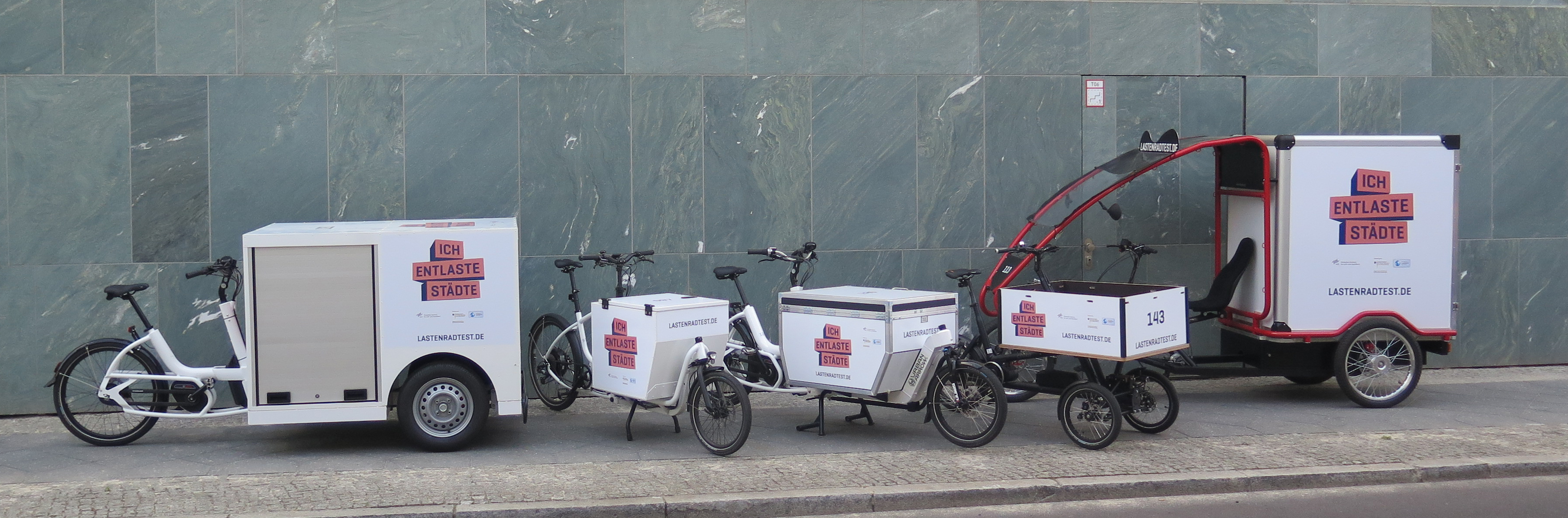 Mit 150 Lastenrädern unterhält Ich entlaste Städte mittlerweile die größte Lastenrad-Testflotte in Europa. Die Zusammensetzung der Testflotte aus fünf Lastenrad-Grundtypen mit insgesamt 23 Modellen ist ebenfalls einmalig und erlaubt ein breites gewerbliches Anwendungsspektrum. Unternehmen und Institutionen aus dem gesamten Bundesgebiet können sich für einen dreimonatigen Lastenrad-Test bewerben und dabei ein Wunschmodell angeben.