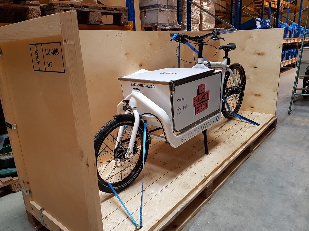 Zuständig für den Projektfuhrpark und die Zustellung der Lastenräder zu den Testern ist das Berliner Kurierunternehmen messenger. Auf längere Reisen zum nächsten Tester gehen die meisten Lastenräder in projekteigenen palletierten Holzboxen. Das ermöglicht einen sicheren und unkomplizierten Transport als Stückgut durch Logistikunternehmen. Die Holzboxen sind über die gesamte Projektdauer wiederverwertbar.