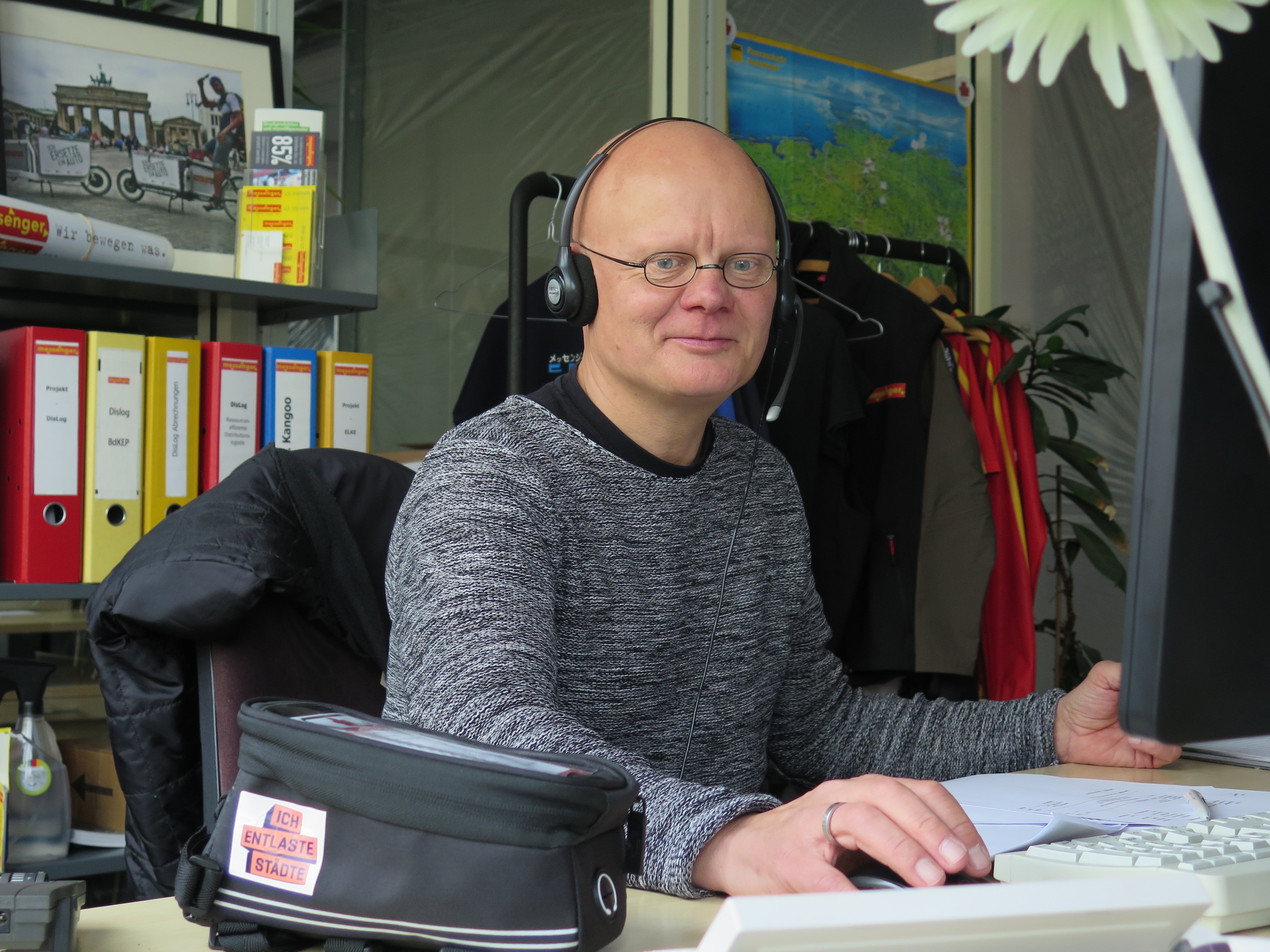 Die projekteigene Versandbox und Projekt-Cheflogistiker Dirk Brauer von messenger. Fotos: Thomas Abel/Cargo Velo Services, Arne Behrensen/cargobike.jetzt