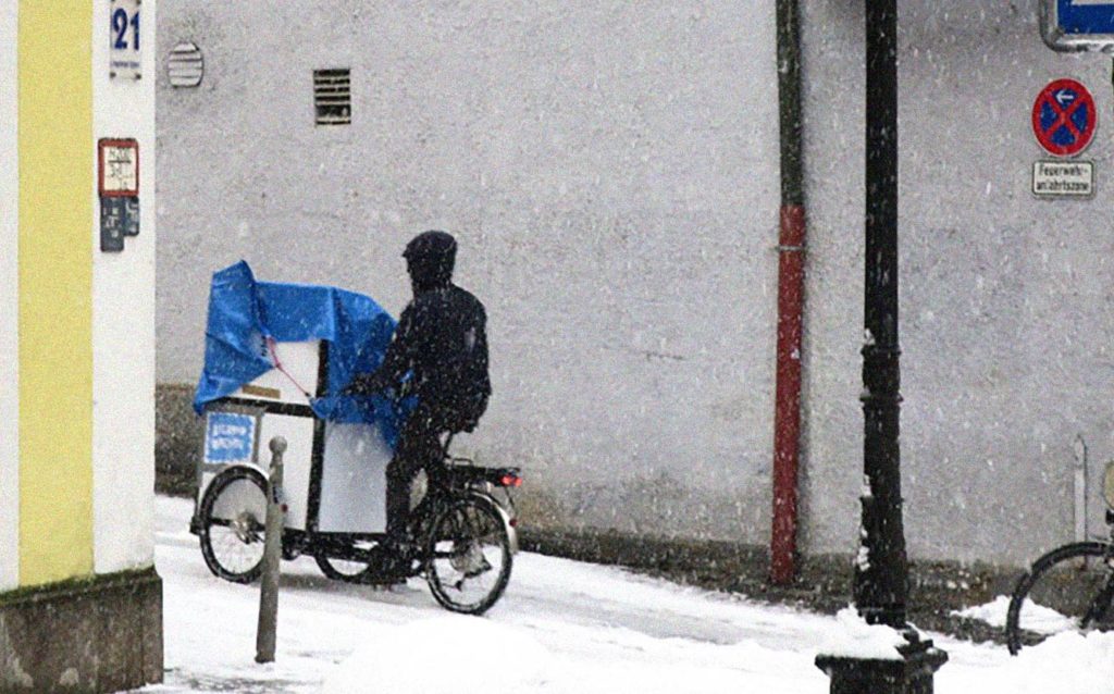 Auch der Fahrradkurier Feliks Aleksander ist davon überzeugt, dass das Lastenrad immer einsetzbar ist. „Zu Beginn sollte man den Lernprozess nicht unterschätzen, aber sobald man eingefahren ist, sollte man sich unbedingt trauen, das Lastenrad bei allen Witterungsbedingungen zu fahren.“ Der Schnee bringt sogar Vorteile mit sich. „Mit dem Lastenrad walzt man einfach über den schneebedeckten Boden. Das bietet sogar einen gewissen Spaßfaktor, da man ähnlich wie beim Auto kontrolliert driften kann. Auf einem normalen Fahrrad würde man bei eisigen Temperaturen mit fünf Stundenkilometern dahinschleichen, um sicherzugehen, dass man nicht ausrutscht. Auf dem Cargobike ist das Fahrgefühl bei jeder Witterungsbedingung stabil und sicher“, erklärt der Musiker. Es überrascht daher nicht, dass er seine bislang längste Tour auf dem Lastenrad – nämlich die 20 Kilometer von Dachau nach München – bei Schnee gefahren ist. „Das hat alles wunderbar funktioniert und war sehr schön.“